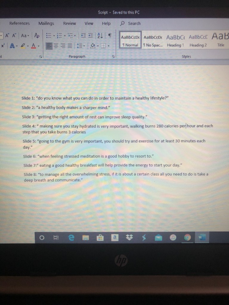 The feedback from my peers and professor has been very beneficial in several different ways. Comments from my peers would do more than just give encouragement but include suggestions and questions for me to answer throughout my work. Feedback given by Dr. Ashby allowed me to evaluate other sources that may be useful. It allowed me to answer questions that my audience may have about maintaining a healthy lifestyle on campus. Applying the feedback, I was given allowed me to fix minor details and add a few things that made my website more organized.